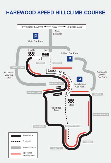 My second event saw me at my local track (3 miles from home) Harewood Hillclimb. I have been spectating here for many years and had two passenger rides up the hill many years ago. The course actually goes downhill to start with before then climbing back up the hill. The course is 1448.25 metres long. The map is from www.harewoodhill.co.uk