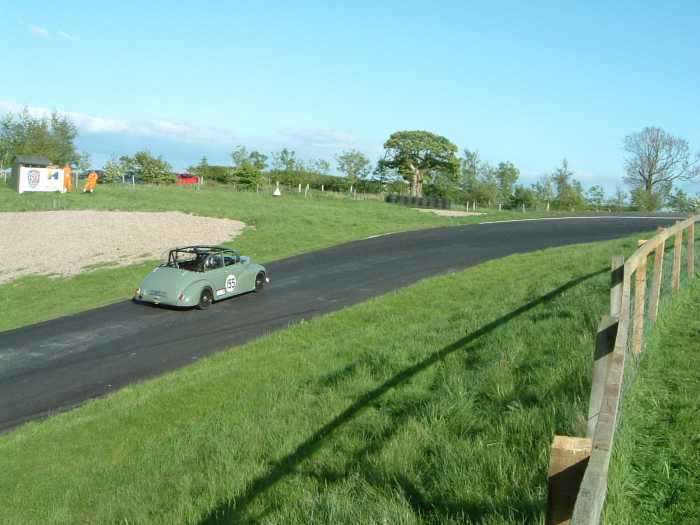 Farmhouse Bend......75mph, time....73.47 secs. 2nd Practice run: 1st Timed Run: Notes: I tried to concentrate on the lines on this run and get the power down early. The time was lost in the middle of the track (Country, Willow, Orchard and Farmhouse). I was getting understeer in the Esses and Chippy`s. 2nd Timed Run: Notes: Due to the understeer experienced on the previous run I softened the front anti roll bar (moved the drop link approx. 30mm along the bar). The slow time on this run is due to me going off the track at Country Corner. I braked a bit later and did not make the corner. On reflection if I had come off the brakes and turned in I am sure I would have got around the corner. After this incident I then drove up the track quite steadily. However the car felt much better (before I went off), with less understeer yet still putting the power down well. 3rd Timed Run Notes: I softened the front bar by moving the drop link another 20mm along the bar to its softest setting. I was pleased with the time though slightly disappointed not to get under 70 seconds. The car had less understeer, but is still putting the power down well out of corners. Turn in is still good. As the grip is increased at the front (by softening the bar) the likelihood of power down oversteer increases, but I am still able to accelerate hard out of the corners. Summary: A very satisfactory first visit to Harewood. I was