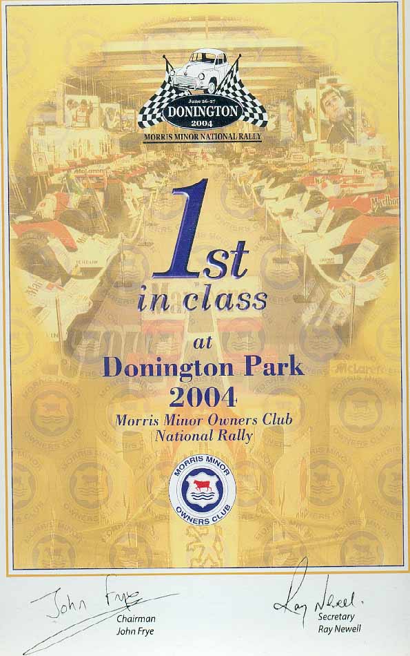 This event was the Morris Minor Owners Club National Rally at Donington Race Circuit. Normally this is a static only event where the cars are parked up on a field for people to look at and be judged. However this year we had use of a small section of track known as the Melbourne Loop on the Saturday. I had paid for five laps and thought it would be a good chance for brother Robin to drive the car. I would also be able to see how the car looked at speed, how much it rolled, reacted over bumps etc. The day was wet so it would be the first time the car had been driven hard in the wet. Robin enjoyed his laps and gave me useful feedback as to how the car felt. He said the car turned in very well but gave little feed back as to when the limit was reached. I also felt this, the steering did not give as much feedback as I expected at the limit of front tyre adhesion. I managed to also get quite a few laps in as other people paid for me to take them around the track. Sunday was static show day. I won a special award for my car. I received a nice certificate (below) and a bottle of polish and a cloth. It was great to get a useful prize instead of a cheap plastic trophy that gathers dust.